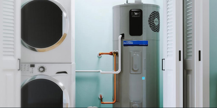 A hybrid water heater combines standard electric heating elements with a built-in heat pump that draws heat from the surrounding air to warm the water.