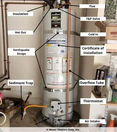 A traditional electric water heater uses heating elements inside the tank to warm the water.